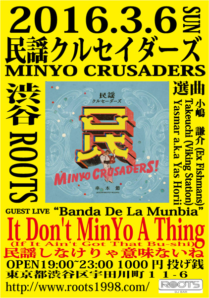 前回大好評だった 「民謡クルセイダーズ」@ROOTSがまたやってくる 今回は選曲にYasmar a.k.a Yas Horii(TOP GEAR) Takeuchi(Viking Station) 小嶋 謙介(Ex Fishmans)また、ゲストライブにコロンビアのクラシッククンビアのカバーやオリジナルクンビアを演奏する注目 のクンビアバンド. 『Banda De La Munbia』と豪華に行いたいと思います。