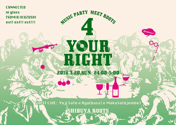 DJ SCRATCHY、GAZ MAYALL、CUMBIA KID aka JASON MAYALL、大貫憲章、JIM WEST (GAZ`S ROCKIN BLUES)、VERY BE CAREFUL、CHE SUDAKA 等の伝説的アーティストの出演で話題のCLANDESTINO。毎月第4火曜日、渋谷の隠れ家的CLUB「ROOTS」で行われるレギュラーイベント「CLANDESTINO」。CARIBBEAN DANDY、未来世紀メキシコ、REBEL FIESTA PARTY、PACHAMAMA、 JAPONICUS出身のDJs達が一同に集い、共演する。渋谷という多国籍な土地で、MESTIZO、CUMBIA、 CUARTETO、PATXANKA、ROCK LATINO、REBEL MUSIC等をMIXさせた音楽で踊る。日本でありながら、異国の地に足をふみ入れたようなボーダレスな大人の空間を演出。毎月海外アーティストのサポートDJをこなし、ヨーロッパ・アメリカ等でも活躍するCUMBIA、MESTIZO、PATXANKA、REBEL MUSICオリジネーターの彼らにしか表現出来ない、自由なDJプレイは必見です。