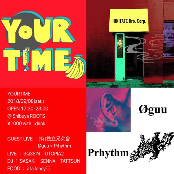 DJ&ライブを軸にクロスオーバーに展開するパーティーYOURTIME。今回のゲストは、YOURTIME準レギュラーのジャムファンクバンド、(有)挽立兄弟舎がさらにジャムさに磨きをかけて登場。そして、brightn buseとしてのライブから1年半振りにØguuがPrhythmをフィチャーしてビートライブをパフォーマンス。