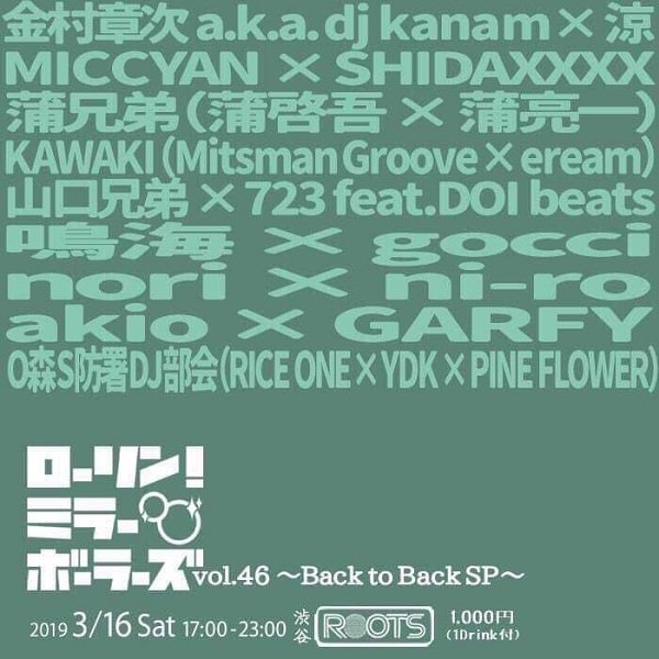 DJ金村章次 a.k.a. dj kanam × 涼 MICCYAN × SHIDAXXXX 蒲兄弟(蒲 啓吾 × 蒲 亮一) KAWAKI(Mitsman Groove × eream) 山口兄弟 × 723 feat.DOI beats 鳴海 × gocci nori × ni-ro akio × GARFY O森S防署DJ部会(RICE ONE × YDK × PINE FLOWER)