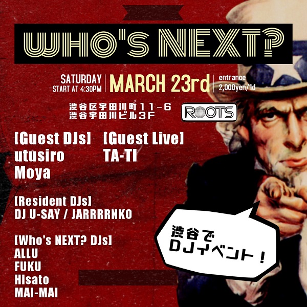 3月23日(土)に、Who’s NEXT?のDJ陣が集結し、渋谷を熱く盛り上げます!! 今回は超技巧派DJ陣を集結致しました!Instagram https://www.instagram.com/whos_next_freedom/