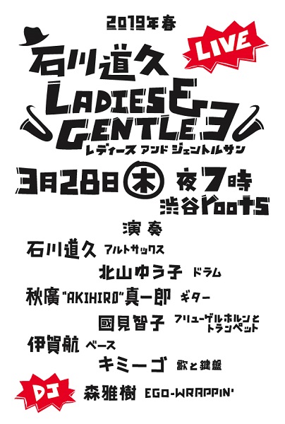 演奏石川道久レディース&ジェントル3[石川道久 アルトサックス、秋廣”AKIHIRO”真一郎 ギター、伊賀航 ベース、北山ゆう子 ドラムス、國見智子 フリューゲルホルンとトランペット、キミーゴ キーボードとヴォーカル