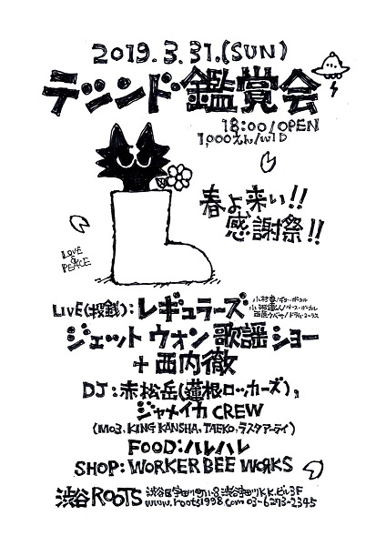DJISOROQU(TooRooms) 楠本チヒロ(踊りたいヨル) TAKEMASA(眼) TAKA(眼) UCHIYAMA(眼) ICHIMURA AI ツーフィンガー鷹 金子ヨシタカ(インナーサック) やまんしろう(宮益坂音響装置) ツボ(宮益坂音響装置) トシ⭐︎西岡(☆ですこ☆) 長坂ガリヲ(渋谷ROOTS) & more…